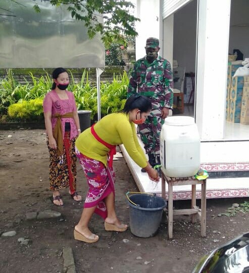 Dirinya selaku Babinsa Desa Gumrih bersama dengan Pecalang langsung menuju lokasi upacara untuk memantau penerapan protokol kesehatan seperti ketersediaan tempat cuci tangan serta mengingatkan warga maupun undangan yang hadir untuk selalu memakai masker dan menjaga jarak.