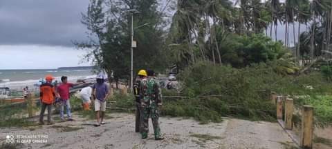 Kegiatan penanganan peristiwa pohon tumbang kembali dilakukan jajaran personil siaga darurat bencana yang pada sekitar pukul 08.50 wita, mendapat informasi dan laporan warga mengenai tumbangnya dua pohon cemara laut di jalan poros Jembatan Metro Bua-Bua.