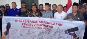 Labusel | TELIKSANDI.id – Organisasi Ikatan Wartawan Online (IWO), SMSI, Alkowar, media TIPIKOR, TV POLRI dan Global Expose TV Barak TV dan media Elektronik lainya tergabung dalam Aliansi Jurnalis Labusel (AJL) menyatakan sikap menolak revisi Undang-Undang Nomor 32 tahun 2022 tentang penyiaran.
