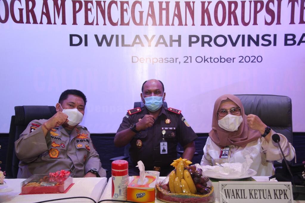 Rakor Program Pencegahan Korupsi Terintegrasi yang digelar di Gedung Perkasa Raga Garwita Polda Bali dilaksanakan dengan tetap mematuhi protokol kesehatan. Wakil Ketua KPK RI, Lili Pintauli Siregar, S.H., M.H., Kapolda Bali Irjen Pol. Dr. Petrus Reinhard Golose dan Kajati Bali, Erbagtyo Rohan, S.H., M.H. hadir dalam rapat tersebut.