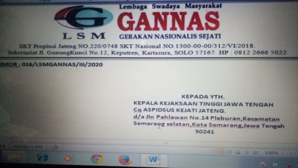 “Sesuai himbaun pemerintah tentang virus Covid-19, saya tak bisa datang ke Kajati, pelaporan cukup saya kirim melakui pos saja, dan surat pelaporan sudah saya buat malam ini, besok tinggal saya kirim ke Kajati Jateng, “pungkasnya.