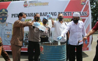 Kemudian kegiatan dilanjutkan dengan pemusnahan barang bukti ribuan botol miras tanpa ijin, hingga miras tradisional. (Selamet).