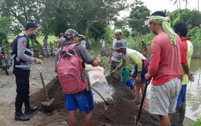 Menyikapi hal tersebut, Bhabinkamtibmas Desa Boal Kecamatan Empang Briptu Ikhsan Putra bersama warga Desa kemudian melaksanakan gotong royong untuk membangun tanggul penahan tanah. Jumat, (26/02/21) pagi.