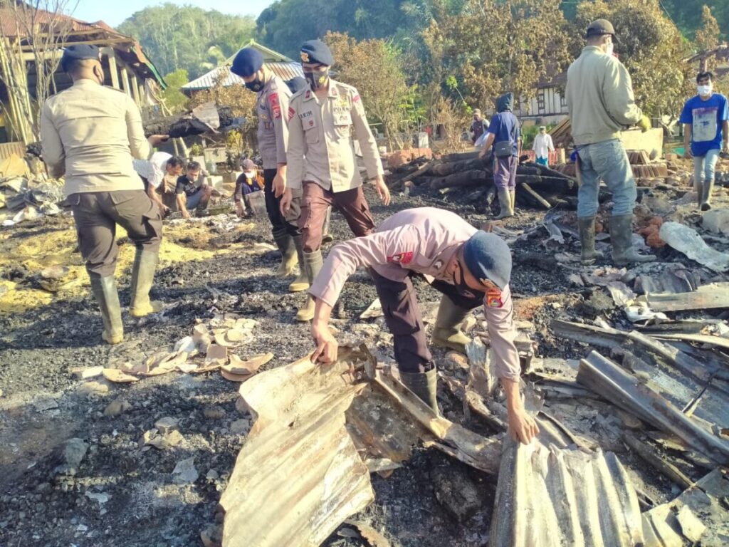 Kebakaran yang diakibatkan oleh meledaknya aki di salah satu rumah warga setempat sehingga menyebabkan puluhan rumah tersebut rata dengan tanah. Personel Brimob membantu membersihkan puing-puing sisa kebakaran dan membangun tenda Darurat untuk warga yang mengungsi bersama masyarakat dan Tim Tanggap Bencana.
