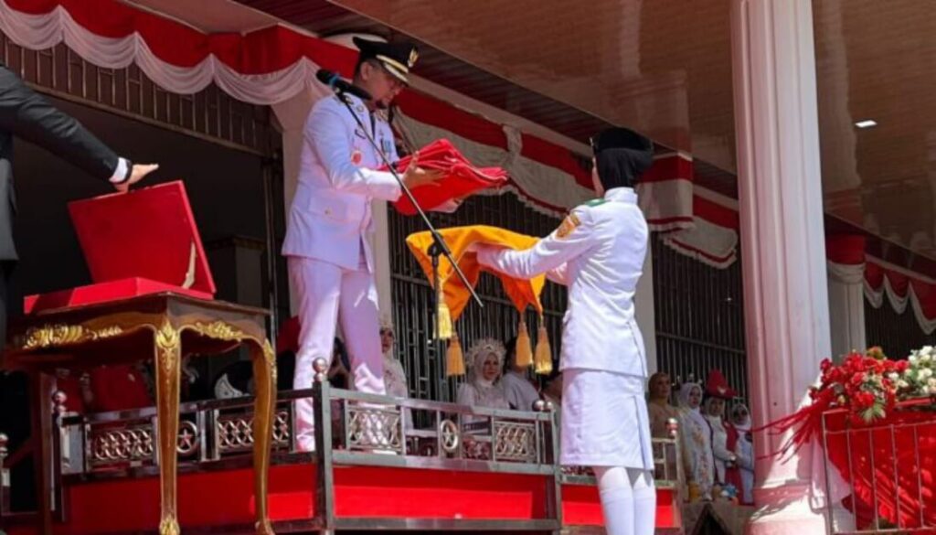 Bupati Kab. Labusel, Fery Sahputra Simatupang menyerahkan bendera kepada pembawa baki pada Upacara HUT ke 80 RI di Lapangan SBBK