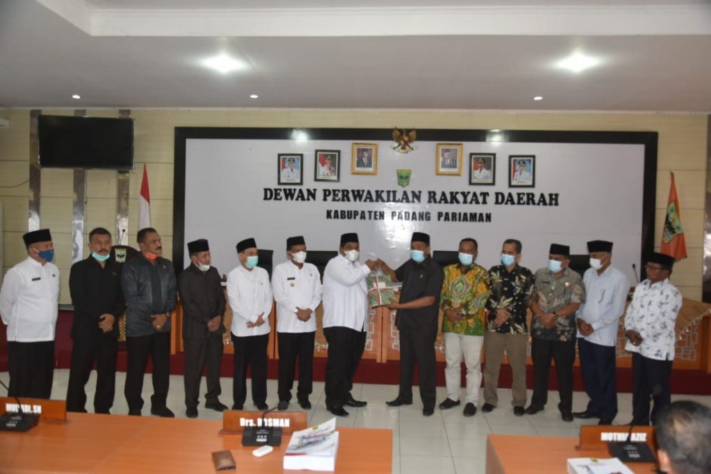 Bupati Padang Pariaman Suhatri Bur,S.E,M.M menyerahkan rancangan awal RPJMD 2021-2026 Kepada Ketua DPRD Kabupaten Padang Pariaman dalam sidang Paripurna yang bertempat di Aula Kantor DPRD Padang Pariaman, Propinsi Sumatra Barat,pada Jum’at 16/4/2021.