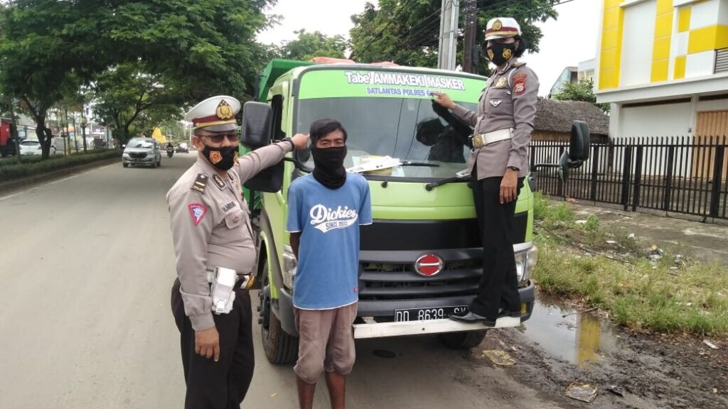 Seperti tampak pada pagi ini KBO Sat Lantas Polres Gowa Iptu Ida Ayu Made SH di dampingi Kanit Dikyasa H.Misbar S.Sos dan beberapa Personil memasang Stiker edukasi bertuliskan “AMMAKEKI MASKER” pada kendaraan Roda 4 dan Roda 6 yang melintas di jalan tersebut.