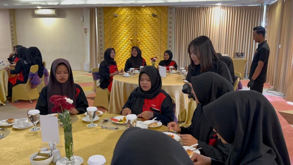 Para siswa tampak antusias mengikuti setiap arahan yang diberikan. Tidak hanya mendengarkan penjelasan, mereka juga mempraktikkan langsung tata cara makan formal dengan penuh kesungguhan. Pengalaman ini menjadi momen penting dalam membangun kepercayaan diri serta memperluas wawasan siswa mengenai standar pelayanan dan etika profesional di dunia perhotelan.