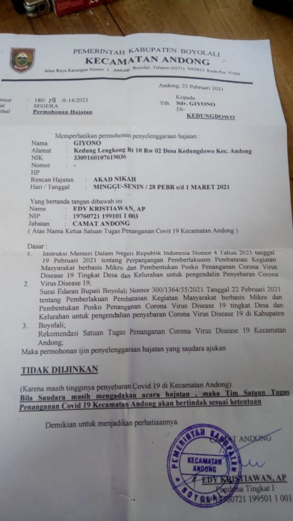 BOYOLALI, Pemberlakuan Pembatasan Kegiatan Masyarakat (PPKM) sebagai pencegahan covid 19 di kecamatan andong kabupaten Boyolali, tepatnya tanggal 1 Maret tahun 2021 lalu di kecamatan andong ada empat tempat yang mengadakan hajatan.