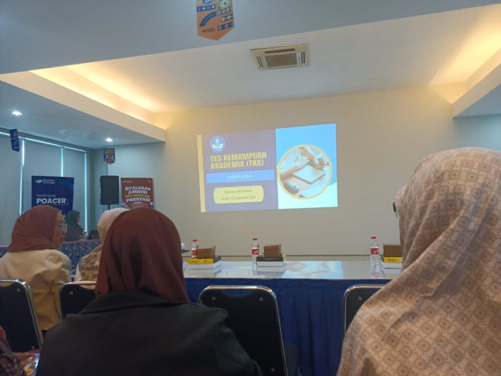 Sementara itu, Erawati, S.Si., M.Pd., sebagai narasumber, berbagi pengalaman dalam menyusun soal TKA di tingkat nasional. Ia menekankan pentingnya validitas, reliabilitas, dan tingkat kesulitan soal yang terukur. Selain itu, ia juga membagikan tips praktis dalam menghadapi soal-soal berorientasi pada keterampilan berpikir tingkat tinggi (Higher Order Thinking Skills/HOTS). “Kita perlu menyiapkan siswa tidak hanya sekadar menghafal rumus, tetapi juga mampu menganalisis, mengevaluasi, dan memecahkan masalah secara ilmiah,” paparnya.