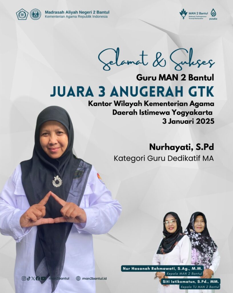 Dengan prestasi ini, MAN 2 Bantul kembali membuktikan dirinya sebagai salah satu madrasah unggul di DIY yang tidak hanya unggul dalam bidang akademik, tetapi juga dalam pengembangan karakter dan keterampilan siswa. Semoga keberhasilan Nur Hayati, S.Pd., ini dapat menginspirasi lebih banyak guru untuk terus berdedikasi dan berinovasi demi kemajuan pendidikan Indonesia.