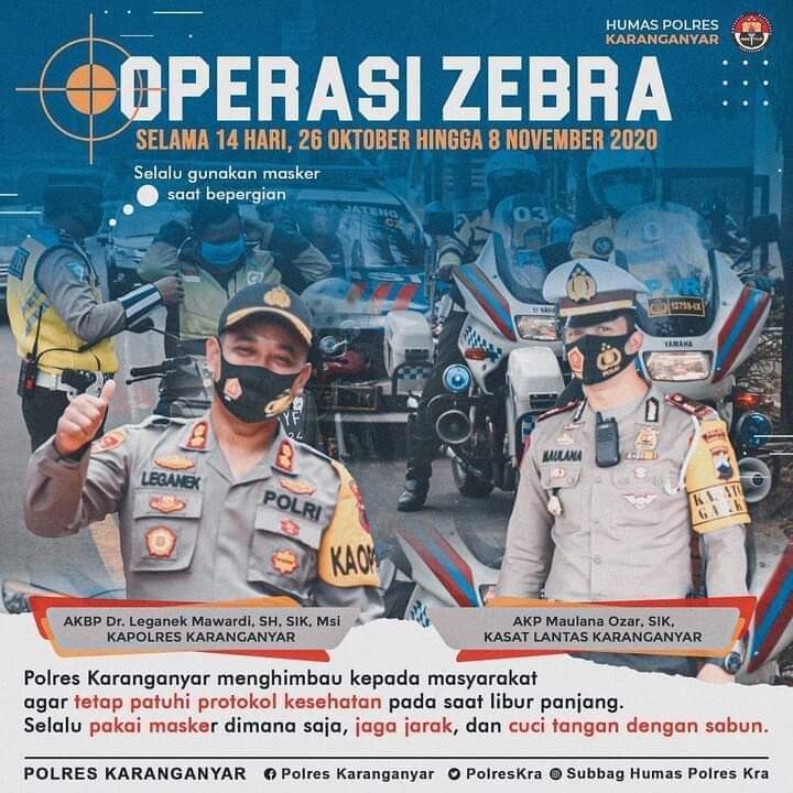 KARANGANYAR | Teliksandi.id – Operasi Zebra Candi 2020 bakal berlangsung selama 14 hari mulai besok Senin 26 Oktober 2020 Sampai Minggu 8 November 2020. Operasi Zebra bakal serentak dilakukan di seluruh Indonesia.
