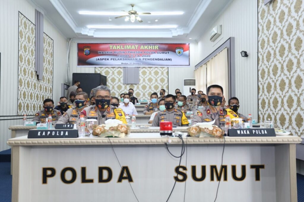 MEDAN | Teliksandi.id – Kapolda Sumut Irjen Pol. Drs. Martuani Sormin, M.Si menutup Taklimat Akhir Wasrik Rutin Itwasda Tahap II T.A. 2020 Melalui video conference bertempat di ruang Vidcon Lt. IV Mapolda Sumut, Rabu (21/10/2020)