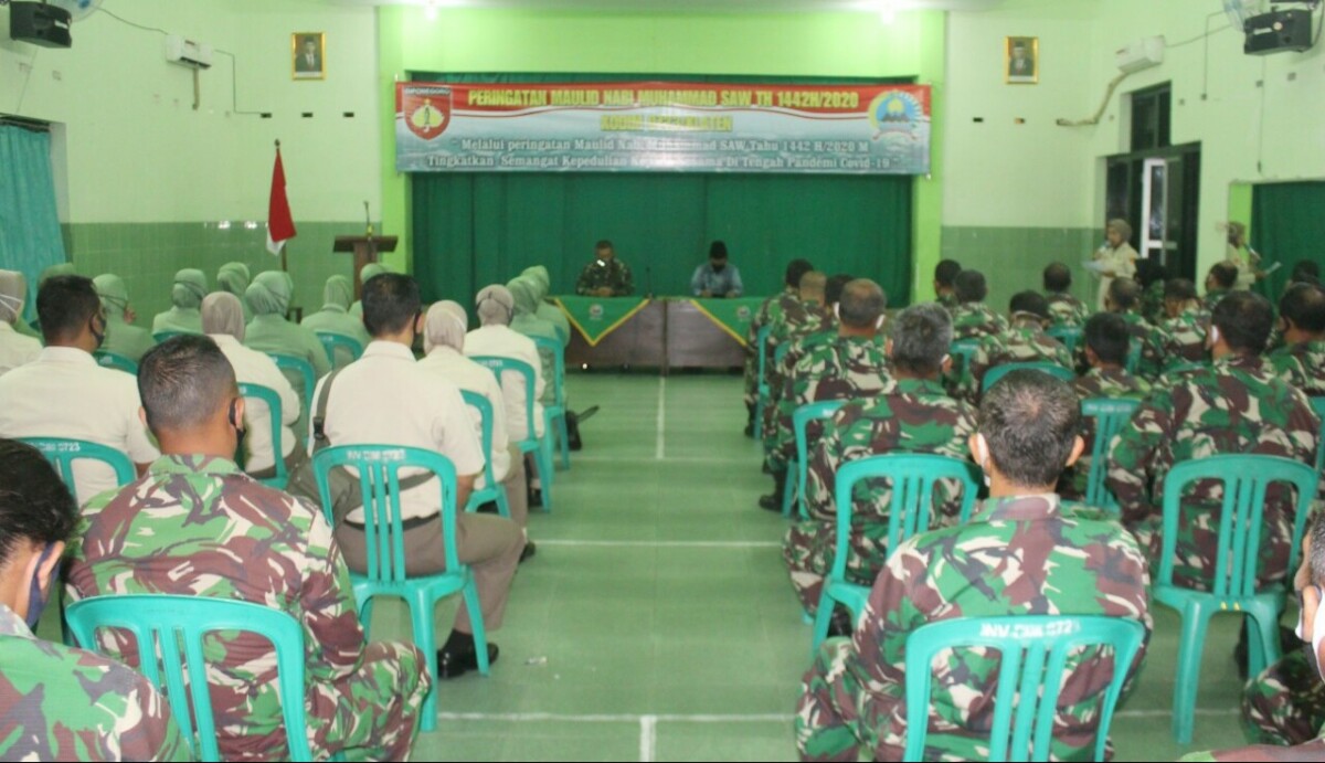 Peringatan Maulid Nabi Muhammad SAW dengan tema, Melalui Maulid Nabi Muhammad SAW 1442 H/ 2020 M Tingkatkan Semangat Kepedulian Kepada Sesama di tengah pandemi covid-19. Selain di hadiri anggota TNI dan PNS Kodim 0723 juga turut hadir para anggota Persatuan Istri Tentara ( Persit ) KCK Cabang X L I V Kodim 0723/ Klaten.