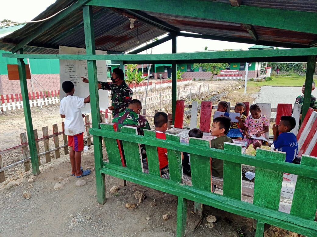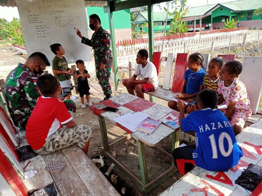 KEEROM | Teliksandi.id – Personel Pos Yamara Satgas Pamtas Republik Indonesia (RI)-Papua Nugini (PNG) Yonif Raider 100/PS memberikan Bimbingan Belajar (Bimbel) kepada anak-anak Kampung Yanemyo, Kabupaten Keerom, Provinsi Papua. Selasa,(20/10/2020).