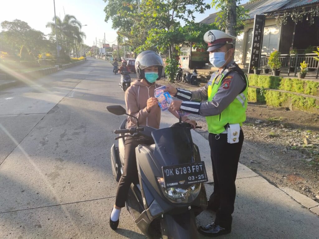 BADUNG | Teliksandi.id – Satuan Lalu Lintas Polres Badung terus mengingatkan pengendara kendaraan untuk hati-hati di jalan, sambil membagikan lembar himbauan, untuk mematuhi peraturan lalu lintas dan mentaati Protokol kesehatan. Sabtu, (7/11/2020).