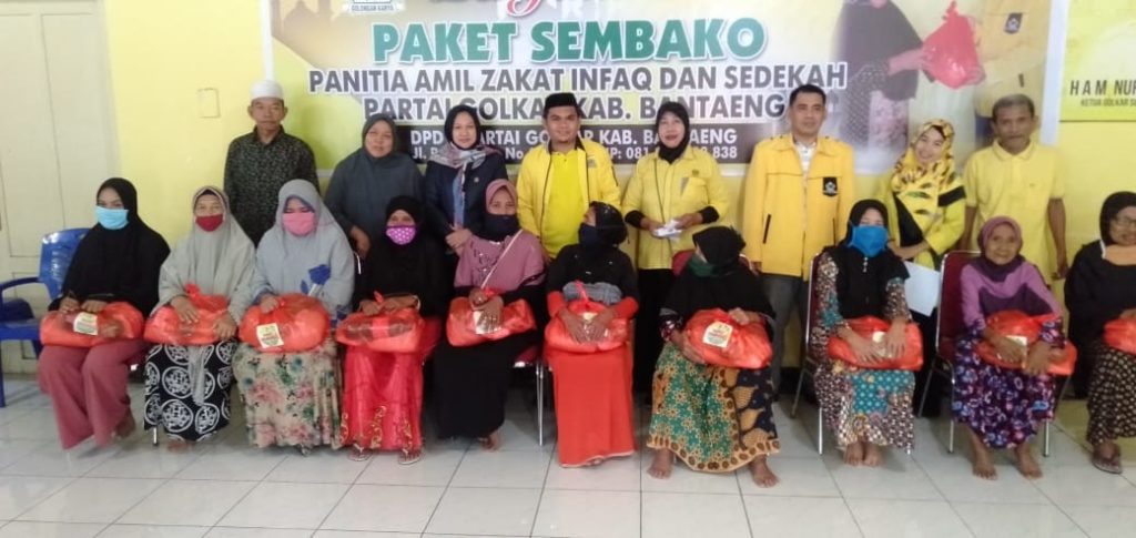 Partai berlambang pohon Berigin membagikan paket sembako 345 paket yang dibagikan langsung oleh seketaris panitia Amil zakat infak dan Sadakah partai Golkar Kab.Bantaeng, Muslimin Husaid