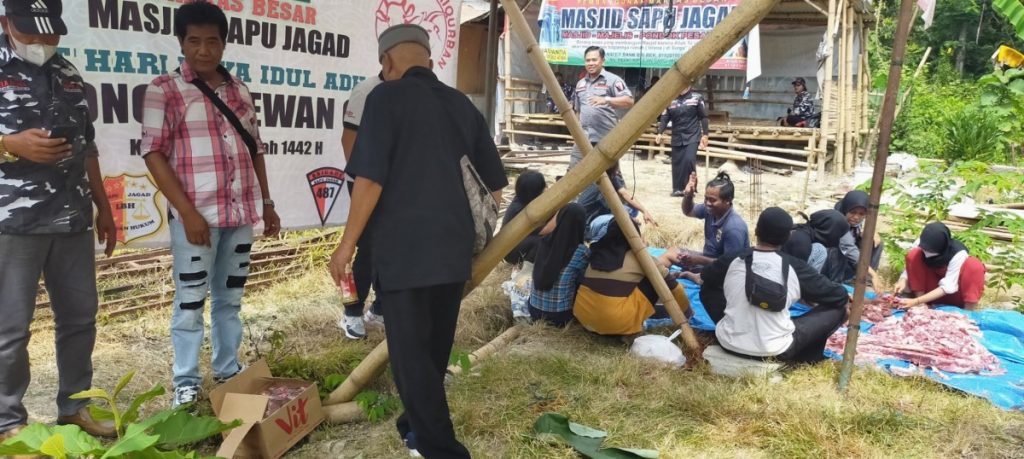 Kegiatan penyembelihan hewan kurban dan pembagian daging berjalan aman dan tertib dengan menggunakan protokol kesehatan.