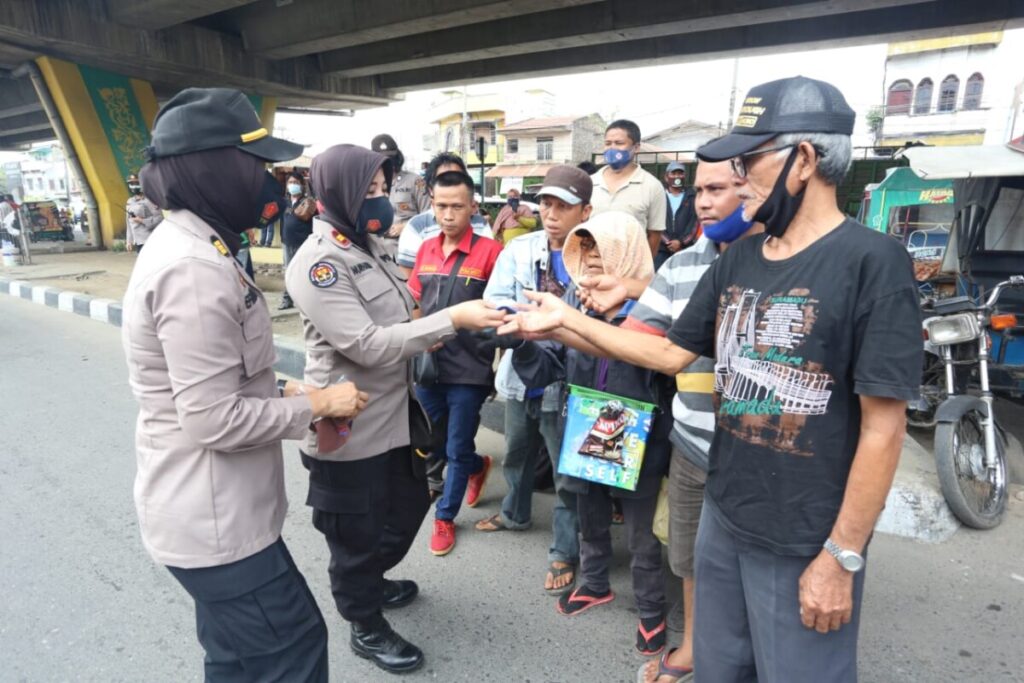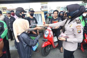 Selain melaksanakan patroli, para personil Polwan turut membagikan masker sebagai upaya mencegah terjadinya klater baru Covid-19 saat aksi demo buruh.