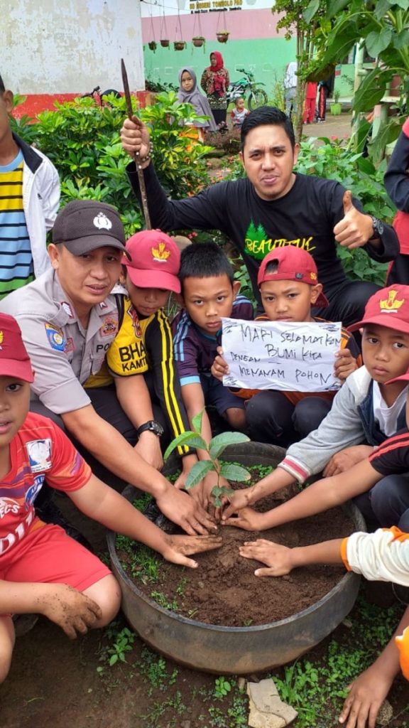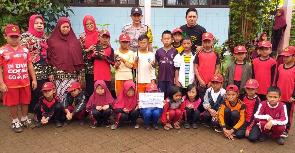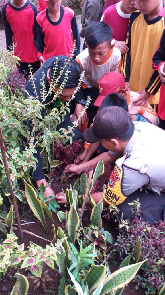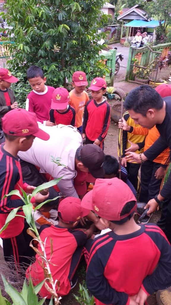 GOWA, TELIKSANDI. ID – Bhabinkamtibmas Polsek Tombolo Pao Gowa Bribka Suherman edukasi pelajar Sekolah Dasar SD tentang pentingnya penanaman pohon juga menjaga kelestarian alam dan lingkungan, (9/1/2020).