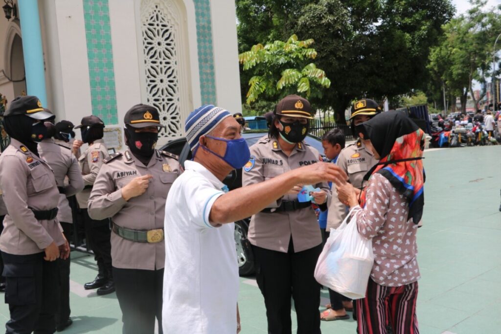Selain patroli, personil Polwan Polda Sumut juga turut membagikan masker sebagai upaya mencegah terjadinya klaster baru Covid-19 saat aksi demo tolak UU Cipta Kerja Omnibuslaw