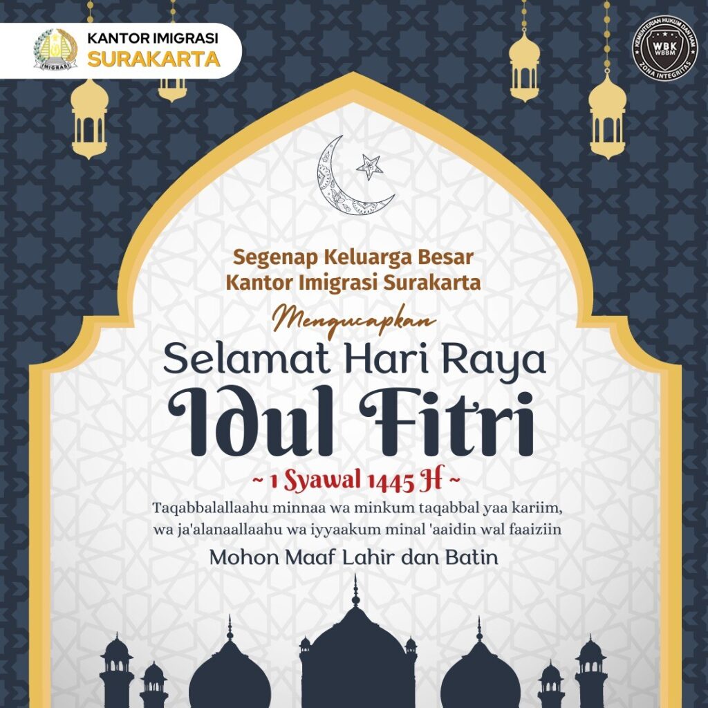 Segenap Keluarga Besar Kantor Imigrasi Surakarta, Mengucapkan: Selamat Hari Taya Idul Fitri 1445 H / 2024 M., Mohon Maaf Lahir Dan Batin. (Red/Uci)