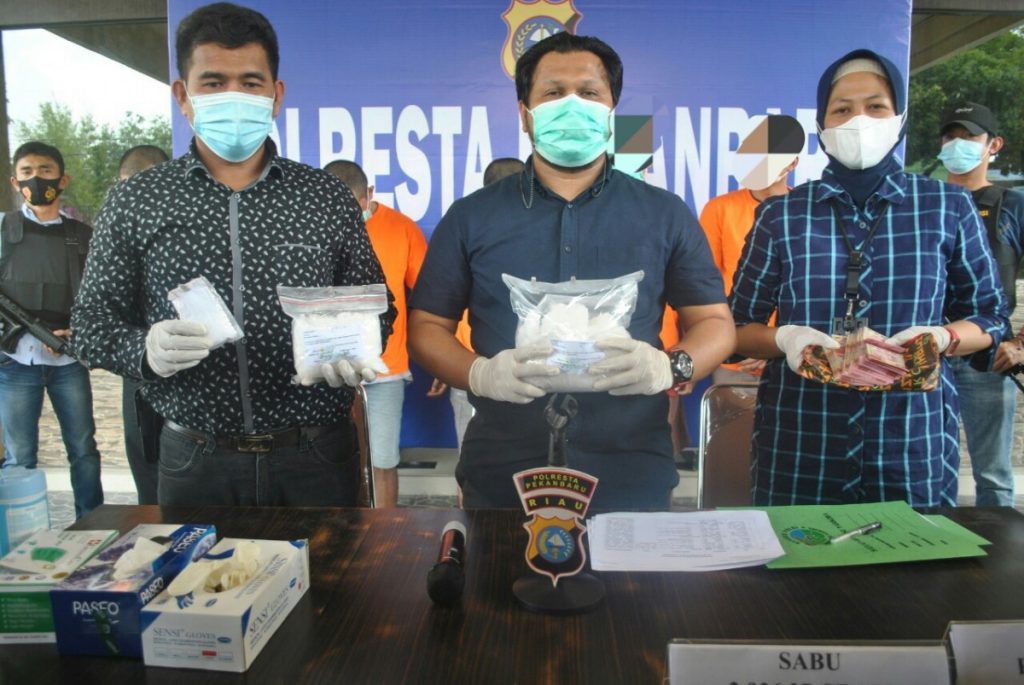 “Ketujuh tersangka yang kita amankan berinisial DF alias Depit (38), RS alias Rudi (38), MH alias Hadori (33), Hen alias Hendra (40), RS alias Rudi, Jun alias Junaidi (45) dan SB alias Sabar (39),” kata Kapolresta Pekanbaru Kombes Pol H Nandang Mumin Wijaya, SIK MH melalui Kasat Resnarkoba Akp Ryan Fajri, SIK didampingi Kanit Resnarkoba Iptu Untari dalam Konferensi Pers pengungkapan Narkoba di Loby Mapolresta Pekanbaru, Selasa (23/2/2021).