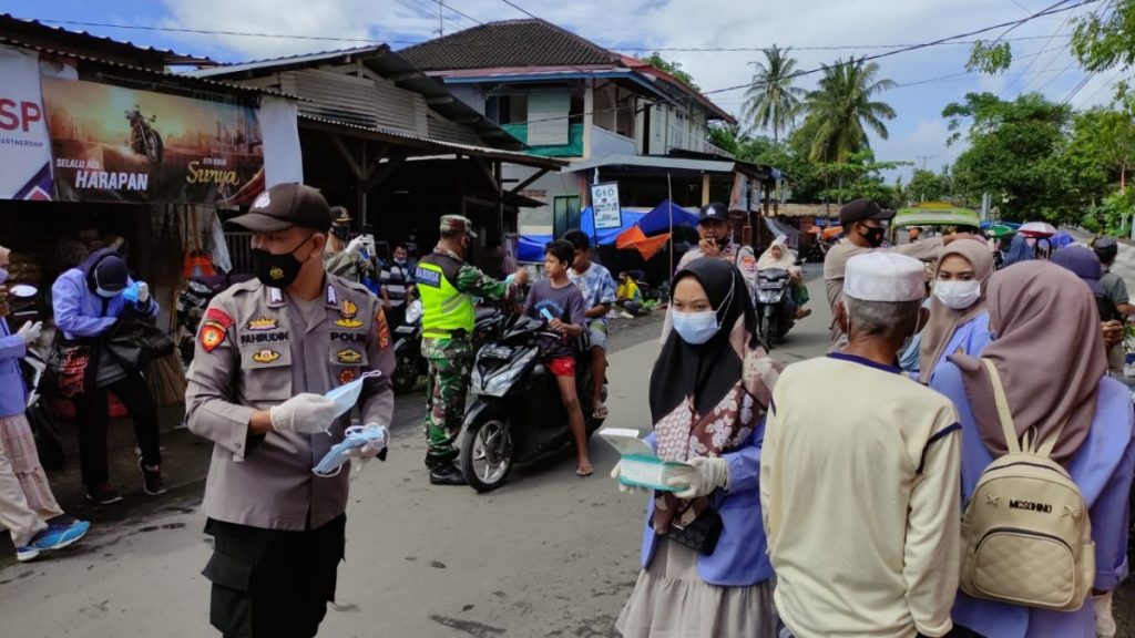 Praya, NTB | Teliksandi.id – Personil Polsek Jonggat Polres Lombok Tengah bersama pemerintah Desa Puyung dan Mahasiswa KKN Terpadu Poltekkes Kemenkes Mataram turun ke pasar Puyung, Kecamatan Jonggat untuk himbauan prokes dan bagi-bagi masker. Minggu, (28/2/21) pagi.