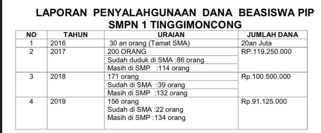 Kemudian Kepala sekolah melaporkan masalah ini ke Kepala Dinas pada Tanggal 22 April 2020 terkait masalah ini dan pihak Dinas mengirimkan Laporan Penerima Beasiswa PIP dari tahun 2017, 2018 dan 2019. Atas anjuran Kepala Dinas , selanjutnya Kepala SMPN 1 Tinggimoncong yang menjabat saat ini, memanggil bapak Sutopo., S.Pd.,M.Si. dan Dahrin ., S.Pd.,M.Si.); menanyakan perihal ini dan mengakui bahwa telah menyalahgunakan dana tersebut selanjutnya siap mengembalikan dan telah menandatangani Surat Pernyataan siap Mengembalikan dana tersebut.