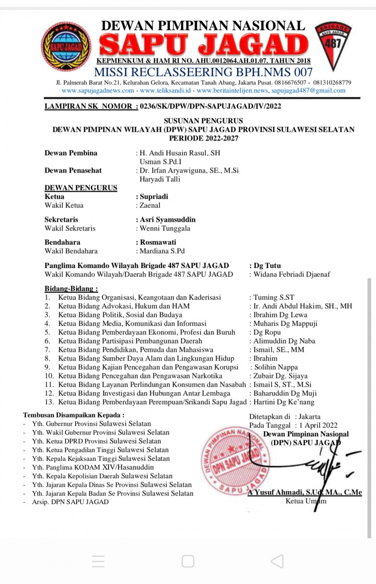 Teliksandi.id, Makassar, Ketua Umum Dewan Pimpinan Nasional (DPN ) SAPUJAGAD PUSAT Gus Yusuf Ahmadi S. Ud memberikan mandat resmi kepada Supriadi bobby daeng toboh selaku ketua definitif DPW SAPUJAGAD SULSEL.