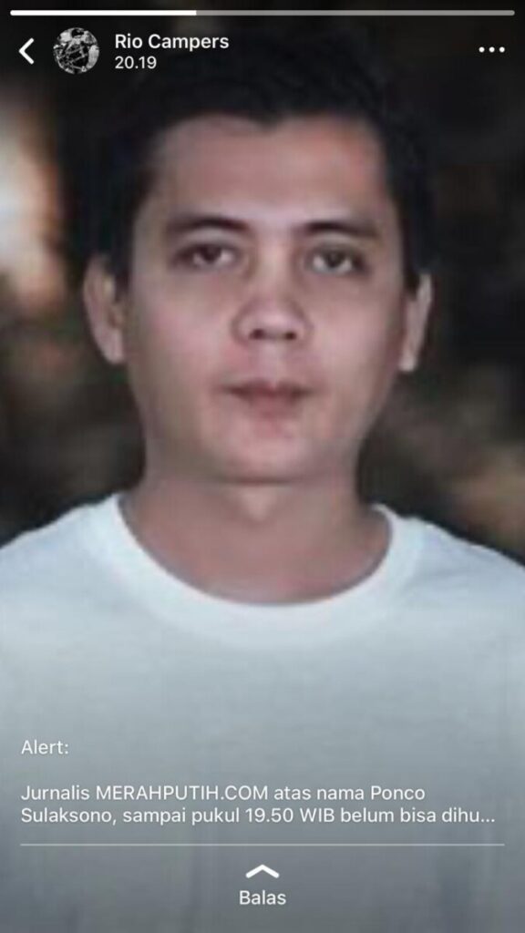 JAKARTA | Teliksandi.id – Jurnalis MERAHPUTIH.COM atas nama Ponco Sulaksono yang bertugas meliput aksi Demonstrasi Penolakan UU Omnibus Law di kawasan Monas Gambir Jakarta Pusat hingga Kamis (8/10) malam pukul 23.30 WIB masih belum diketahui keberadaannya.