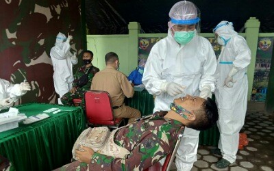 Dengan melibatkan petugas kesehatan dari Pos Kesehatan (Poskes) Kodim 1617 Jembrana bekerja sama dengan petugas dari Dinas Kesehatan Kabupaten Jembrana satu persatu anggota yang terlibat Satgas TMMD menjalani pemeriksaan Rapid Test Antigen Covid – 19.